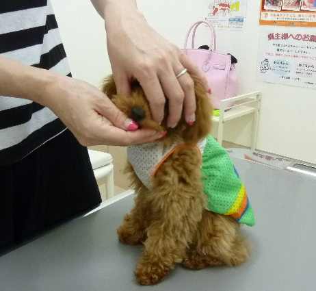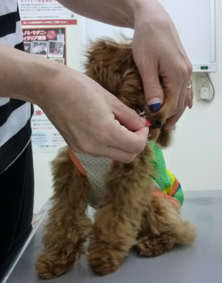 最初は顔を後ろに引いたりして少し嫌がっていましたが何度か練習すると嫌がることも少なくなり上手に出来るようになりました