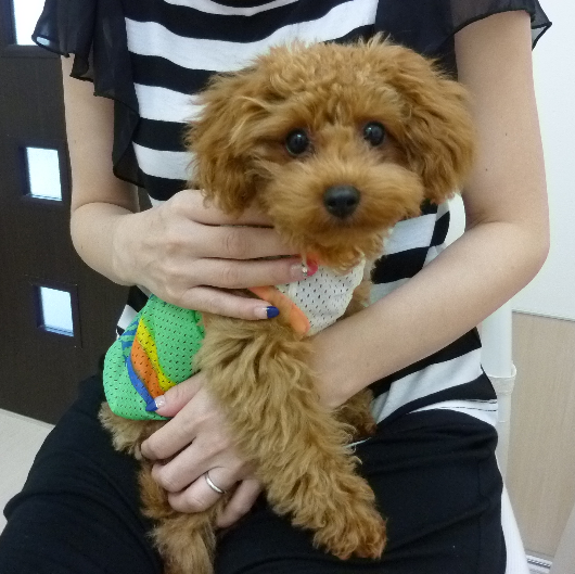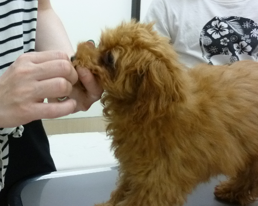 以前パピーパーティーに参加した時は緊張気味でモジモジしていましたが、病院にも少しずつ慣れてきたのか今回はご褒美も喜んで食べ、ご機嫌さんでした