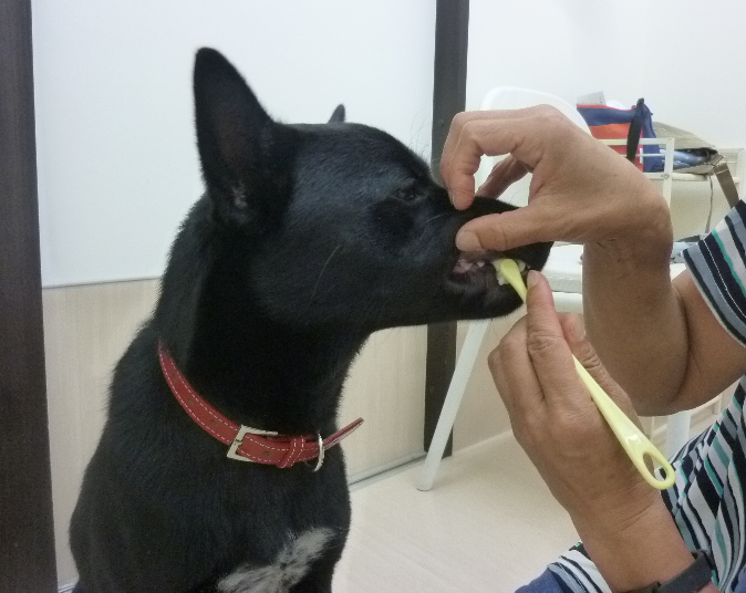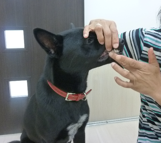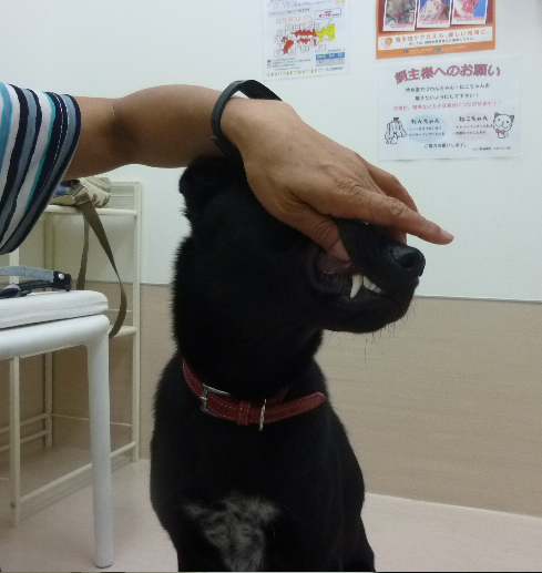 ご褒美を見せて「待て」をさせて唇をめくります