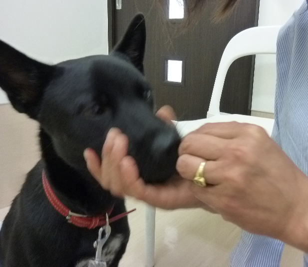 ご褒美を見せて「マテ」をして口周りを触ります