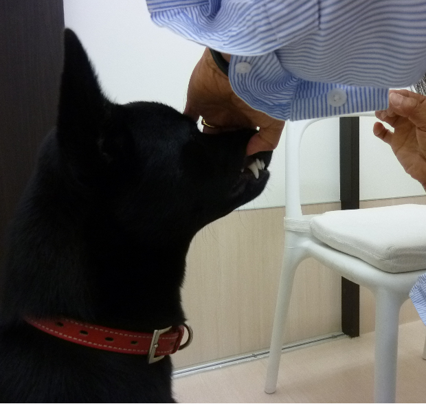 ご褒美を見せて「待て」をさせて、唇をめくります